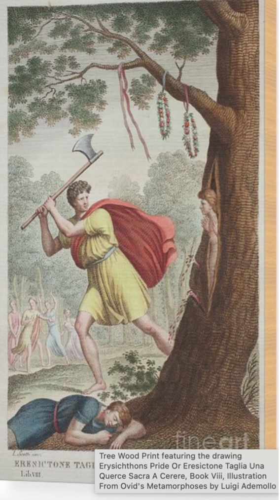 Notice the profound wisdom here. The punishment of insatiable hunger visited upon Erysichthon is actually a revelation of the sickness already in him! The greed that drives the King to cut down the sacred oak foreshadows the fatal toxic hunger that will follow. Even as the King swings at the tree, his inner disease is already at the grave stage. And as we think today about what motives drive the actions that endanger the environment, history will show greed to be the primary engine—insatiable greed to use the precious natural resources of the earth “to advance progress,” which is another way of saying “to secure ease,” which is another way of saying “to make money.”