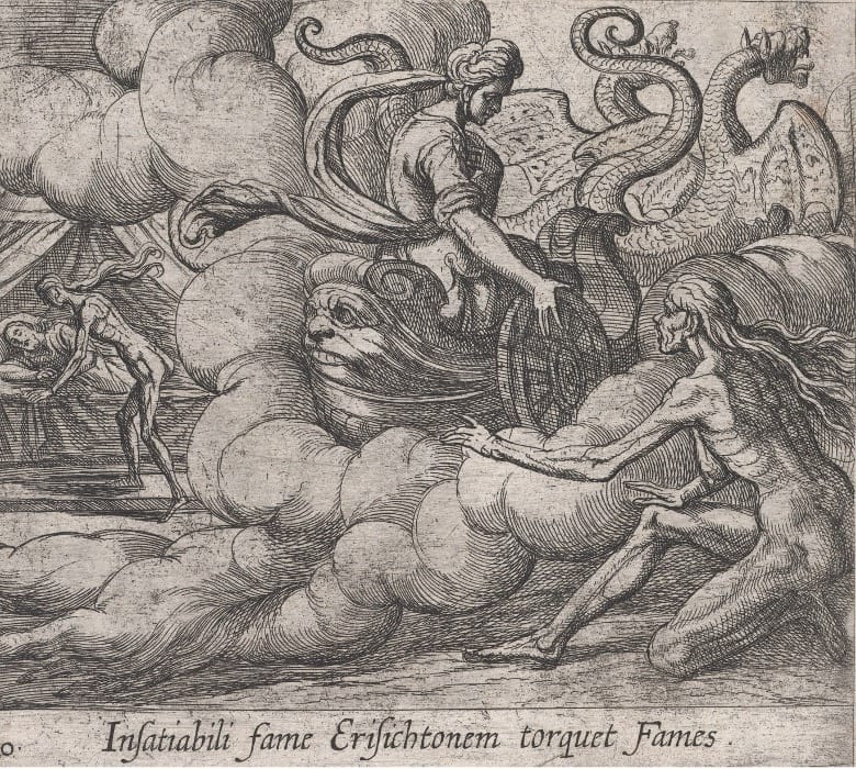 One might assume that the dire warnings of catastrophic consequence proclaimed loudly today to those who are exploiting the environment are a contemporary product of our unique time in history, sparked by the precipitous line toward which we are drawing near. Against this assumption, I recently came across an ancient story which displays this same prophetic grist as far back as the 6th century B.C. I speak of the famous myth of Erysichthon, first mentioned in Pseudo-Hesiod’s poem, The Catalogue of Women. It appears again in Callimachus’ 3rd century B.C. Hymn to Demeter, and again, and, most famously, in Ovid’s Metamorphoses in the first century C.E.