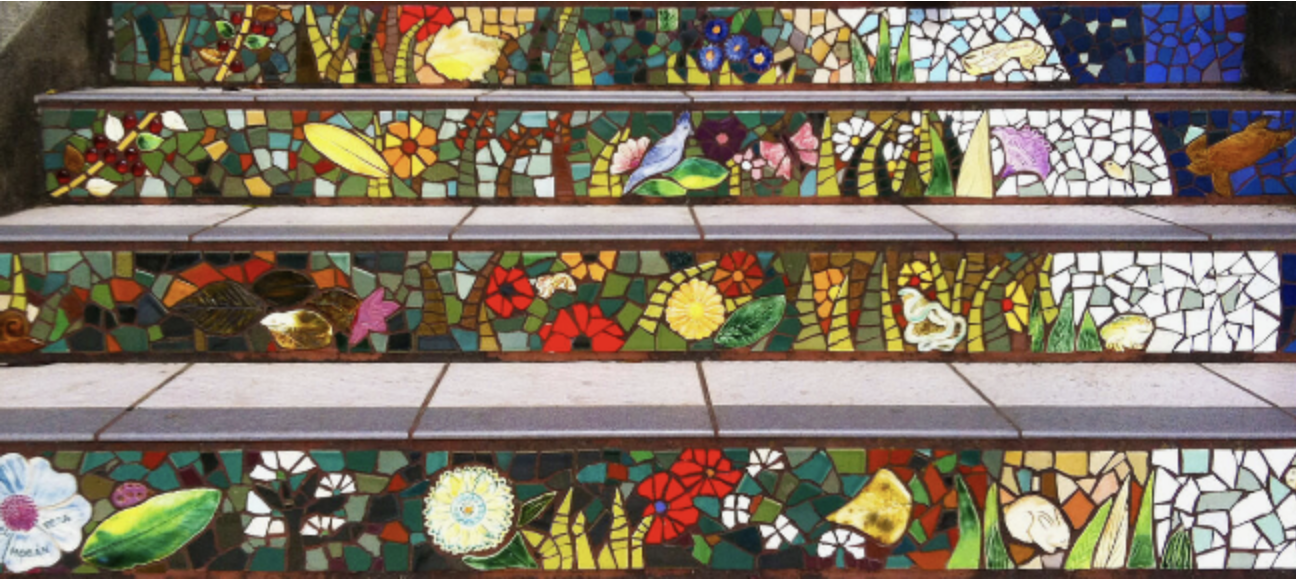 Not just a beautiful set of mosaics, the 16th Avenue Tiled Steps connecting 15th Avenue with 16th Avenue near Moraga Avenue in San Francisco is a work of art, a neighborhood project, a gathering place, and an ecological haven for an endangered species, all in one. From Google Maps, the satellite view shows a long string of gray, concrete steps, but if you go there, you will see something quite different. Read the remainder of this post here.