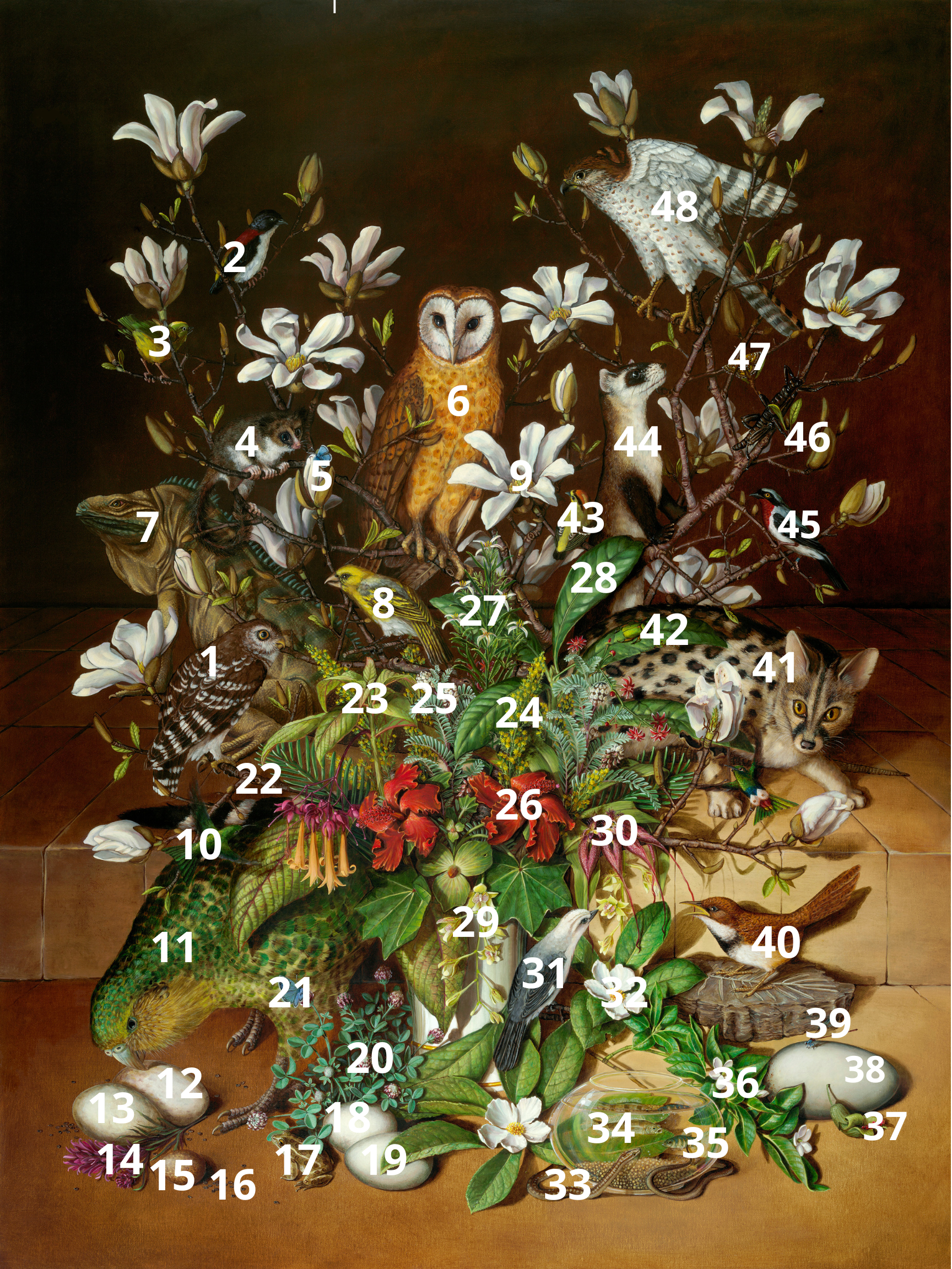Each of these species has its own story, many of which demonstrate the power humans have to change the outcome for species if research and sustained effort are brought to the work. Some in the painting, such as the bald eagle represented by the egg labeled #18, are poster children for regulation, education, and success; the stories of many others are less well-known.