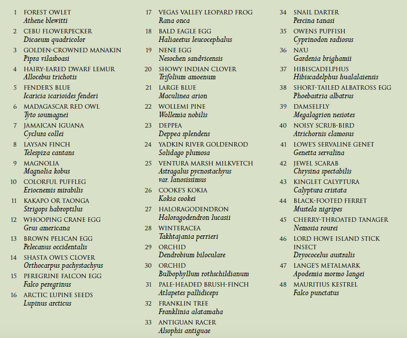 Consider the Owens Pupfish (#35 in the picture). These natives of California's Central Valley from the Owens River and associated sloughs and marshes, have an amazing survival story. During the California Water Wars of the 1920's and 30's, the diversion of water from the Owens River to the Los Angeles Metropolitan Area eliminated most of the pupfish's habitat. Introduced species such as largemouth and smallmouth bass, brown trout, bluegill, crayfish, and bullfrogs further decimated the population. By 1948, the Owens Pupfish was thought to be extinct. Upon its rediscovery, pools were built and barriers erected to keep out nonnative predatory fish, but in 1967 it was listed as endangered, and in 1969, the pools which provided its habitat almost completely dried up due to weather causes. Certain employees of the California Department of Fish and Wildlife were aware of the urgent crisis and raced to an area called Fish Slough with buckets, nets, and aerators in an urgent effort to save the fish. They put 800 of the survivors into mesh cages in a nearby pool, intending to move them to better sites the following day. But, before leaving for the day, one worker, Phil Pister, checked on the fish and realized they were dying from a lack of oxygen due to poor placement in the water flow. With just two buckets on hand, he quickly gathered as many of the still-living fish as he could fit into the buckets and moved them to nearby pools with more aeration. The species survived—because of intense dedication, passion, and hard work (plus a dash of luck). In this article, Phil Pister tells this story in detail, and also gives an overall picture of the importance of saving those species that are at risk.