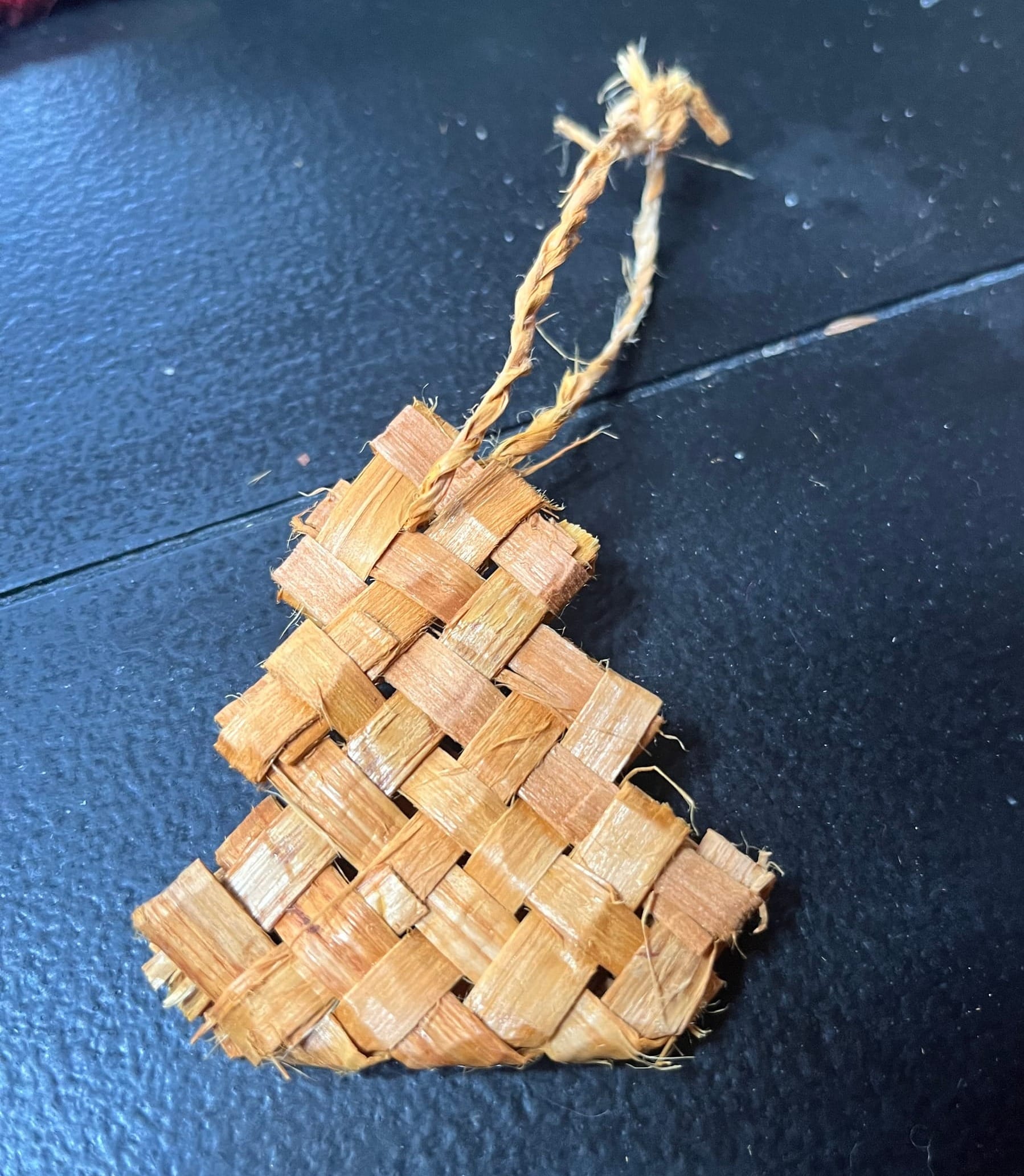 Perhaps my favorite project was making tree ornaments to give away for Christmas. I hung them by a loop of cedar cording, made from the same bark as the ornament itself.