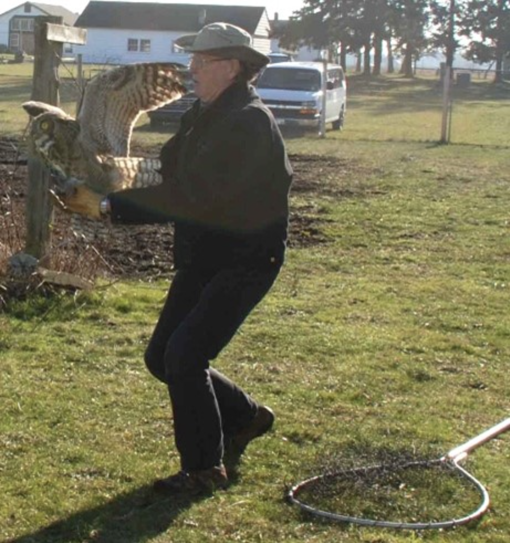 I have had other amazing encounters with avian friends. A few years ago at Pacific Rim Institute, when pheasants, chickens, and ducks were kept in coops next to the road, it was not unusual for large, hungry owls and hawks to find holes in the protective netting. On one occasion, a Great Horned Owl entered on what was clearly a feeding mission. Once discovered, I grabbed my salmon net, entered the cage, and netted the owl. I had to be careful to avoid the business ends – talons and beak! Once in the net, I took the owl out of the pen, chastised it for its bad (but normal) behavior, and released it.