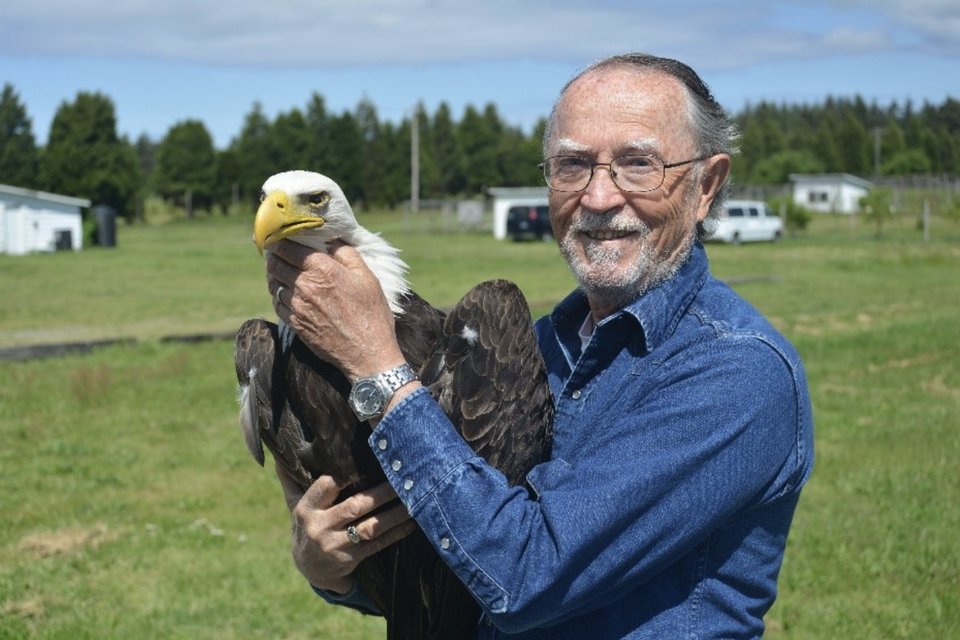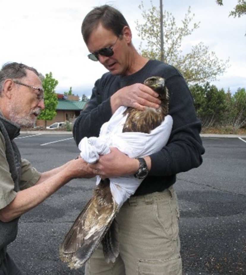 On an Audubon trip to Malheur National Wildlife Refuge in southeastern Oregon that I co-led with my friend, Dr. Dave Parent, we encountered a very large Golden Eagle huddled over a snake in the middle of the highway. We exited the car and approached the bird. It attempted to fly from the road with its prey but could not gain altitude and landed nearby. We grabbed a blanket and were able to cover the eagle, subdue it, and get it into the car.