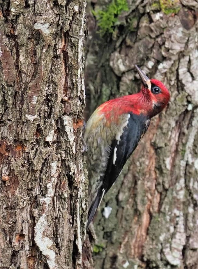 Mac certainly caught this sapsucker at a great moment. Perched on the side of a tree trunk, with an alert black eye and poised beak, the sapsucker both expresses praise and evokes it from those who enjoy his red splash of color and his perpendicular position on the side of the tree.