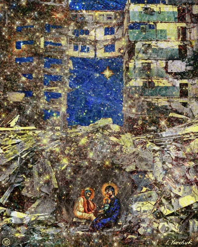 The painting, Nativity 2022, is from Ukrainian-born artist, Irenaeus Yurchuk, now living in the United States. A wartime scene fills the frame of the painting, but stars speckle the devastation with their bits of light. Within the rubble of the city's structures, the stars are bright enough to penetrate even the structures themselves. The brightest star, near the center of the painting, hangs above the three figures of the Holy Family, directing our attention to the hope that exists within that intimate scene, even in the midst of the destruction.