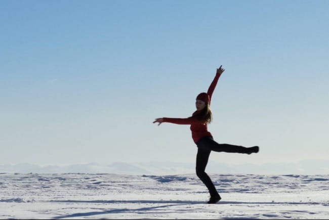 The dance also portrays an intimacy between the dancer and the land. The beginning scenes in which Graham crawls up the rocky surface, the shots of her sliding through the snow, the close up of her with icicles dripping in the background—all of these shots remind us that as humans we can care about and love a place. Although the dancer is physically tiny in that vast landscape, she isn't insignificant; there is a relationship between her and the Antarctica she is dancing across.