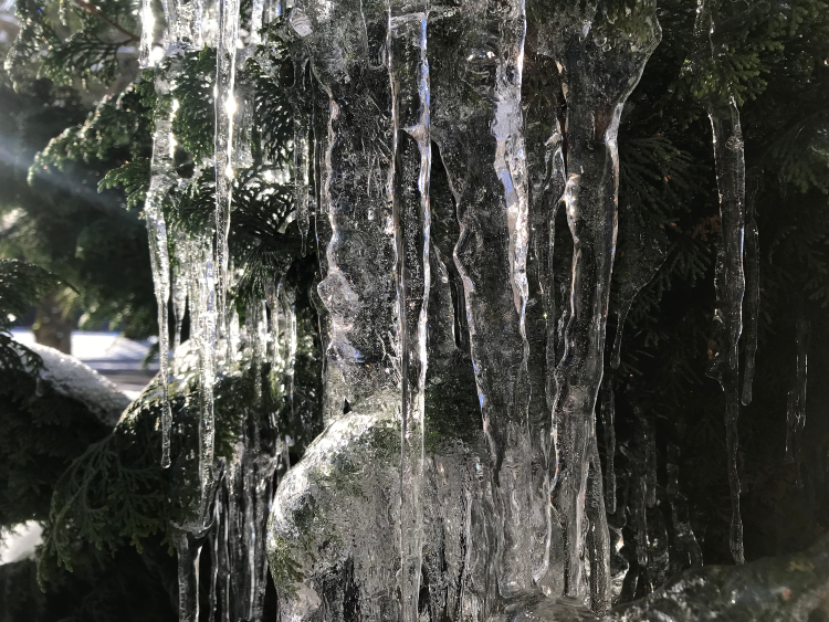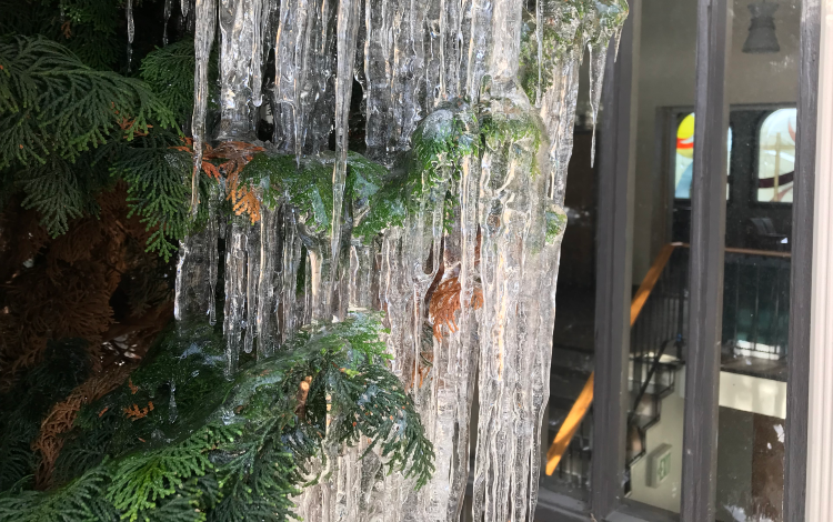About a week into this, when the grief (and anger) were still very, very fresh, I walked outside and encountered the most amazing icicle I had ever seen. It cascaded off the roof of the eaves of our church building, draped itself over and down the branches and trunk of the evergreen tree below until it finally ended on the ground beneath.