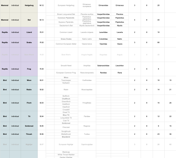They documented the characteristics of each creature: speed, size, eating habits, hours of activity, exact location, etc. A specific set of musical motifs was designed to represent each species based on their characteristics. If an animal moves quickly or slowly, that is portrayed through the music. If it crawls or flies, that is echoed in its sound. The animal's waking and sleeping hours are reflected in how its sound is included the musical composition, with its sound becoming audible as it wakens and becoming muted or silent as it moved toward sleep.