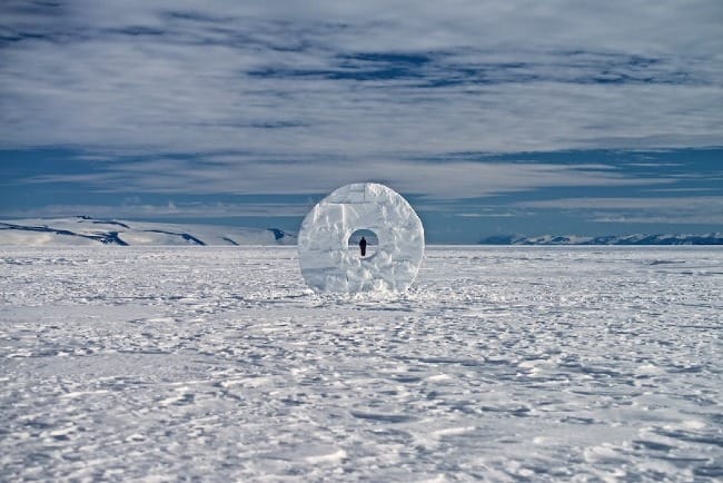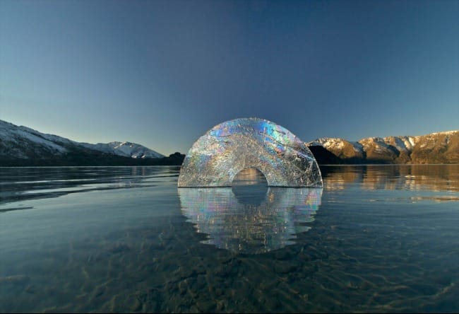 Their art shows both the aesthetic and practical beauty of these systems working harmoniously, and particularly emphasizes the necessity of human systems fitting themselves within the natural systems that exist. You can see the aesthetic beauty of this when you see works such as the one pictured below. The placement of a semicircle upon a reflective surface, such as a lake, turns the surface's reflection into the other half of that semicircle. The result is complete circle, a joint art project on sustainability in which one half of the project is man-made and the other half is nature-made. In a sense, this partnership creates the complete work work of art.