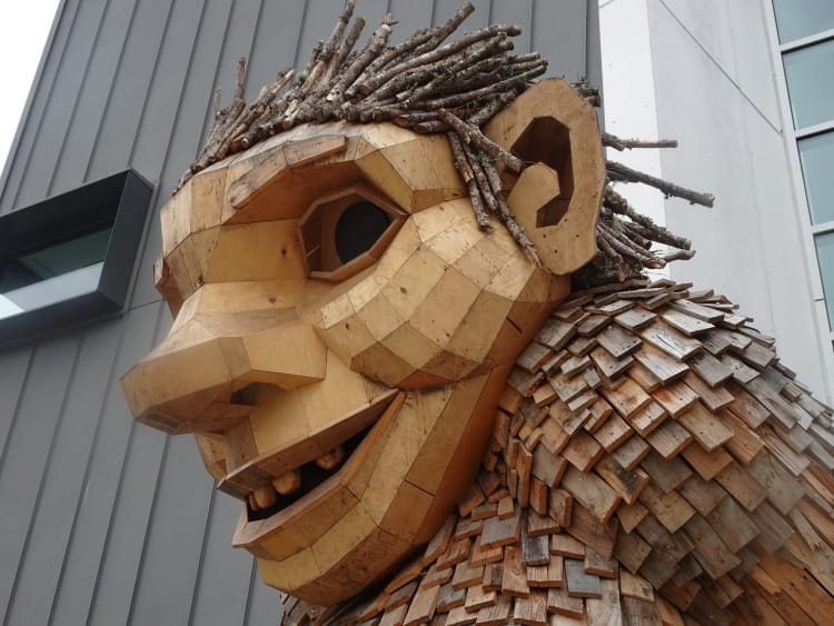 When I wrote that piece three years ago, Dambo’s trolls delighted me, but I didn’t know that I would have the opportunity of seeing any first-hand. Last year, I learned that Dambo planned to create six trolls right in my own backyard—the Pacific Northwest—as part of a series called The Way of the Bird King. I was thrilled that they would be near enough to me to visit in person.