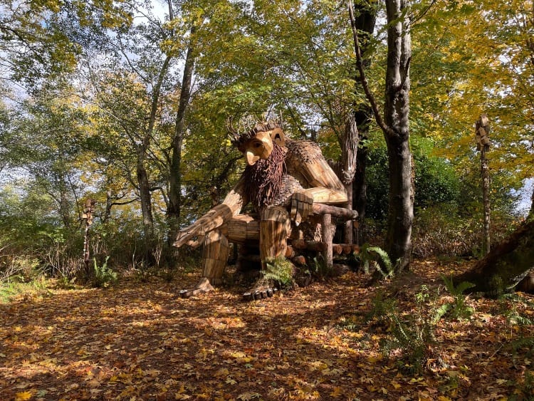 My first sighting of Oscar in the midst of a grove of autumn-colored maple trees stunned me. More than 20 feet tall, he has an air of sternness and power. The sculpture gives the feel of a mighty king sitting on his throne, towering among the treetops, looking downward to those below him.